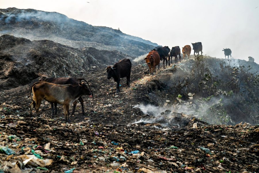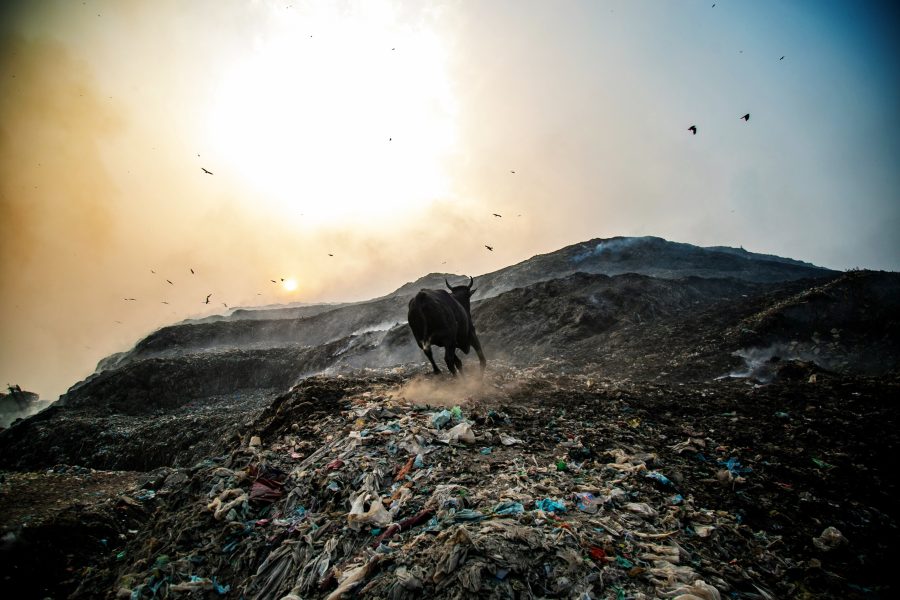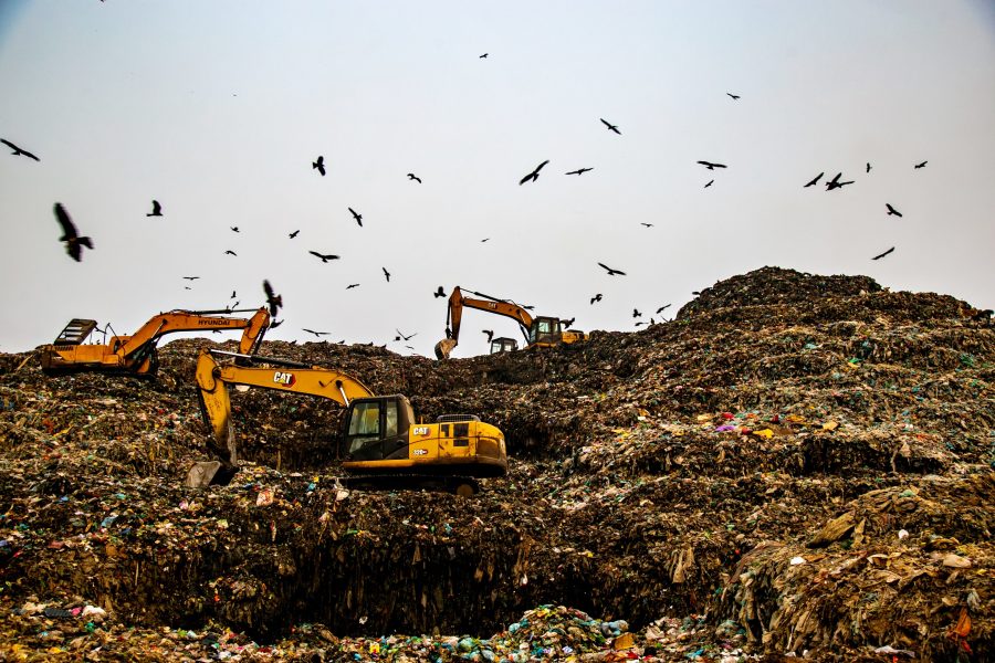 There were countless crows flying around in the garbage dump in a polluted environment.